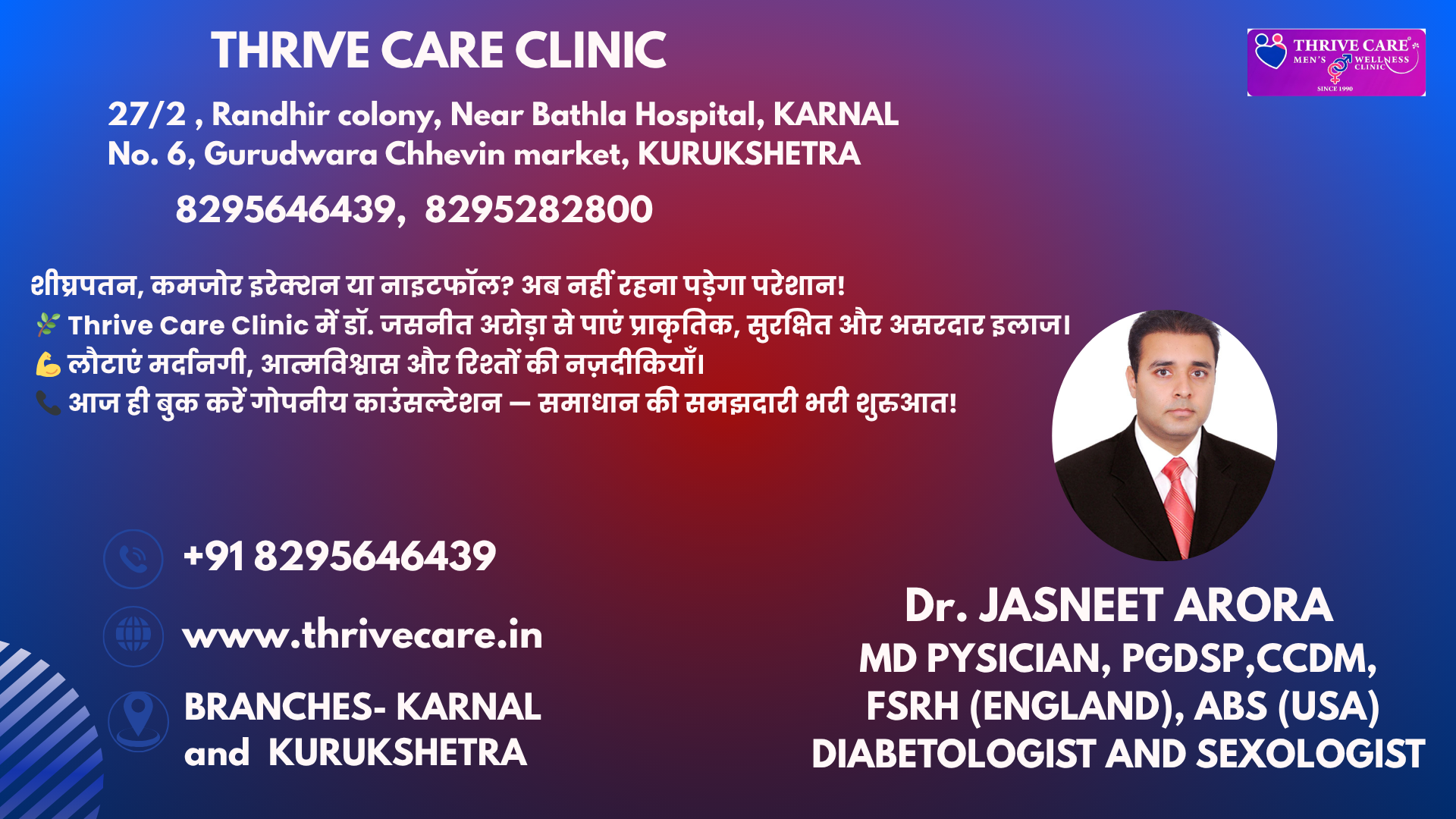 Apni health ko risk par mat daaliye — paaiye expert care aur asli solution sirf Thrive Care par! #thrivecare #drjasneetarora #sexologistinkarnal #sexologistinkaithal #sexologistinkurukshetra #sexologistinpanipat #sexologist #stdtreatment #sexologistnearme #erectiledysfunctiontreatment #prematureejaculationtreatment #bestsexologist #sexualhealthclinic #guptrogdoctor #thrivecareclinic #thrivecareclinickarnal #bestsexologistinindia #sexualhealthclinic #sexologistnearmen #erectiledysfunctiontherapy #prematureejaculation #bestsexologistinkarnal #bestsexologistinkaithal #bestsexologistinkurukshetra #bestsexologistinpanipat #bestsexologistinambala #sexologistinchandigarh #aroradawakhana